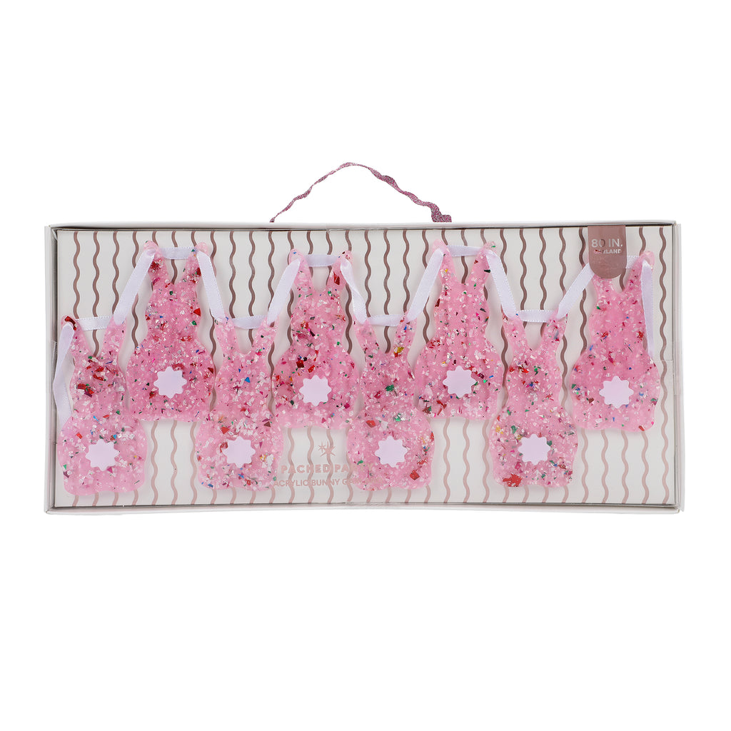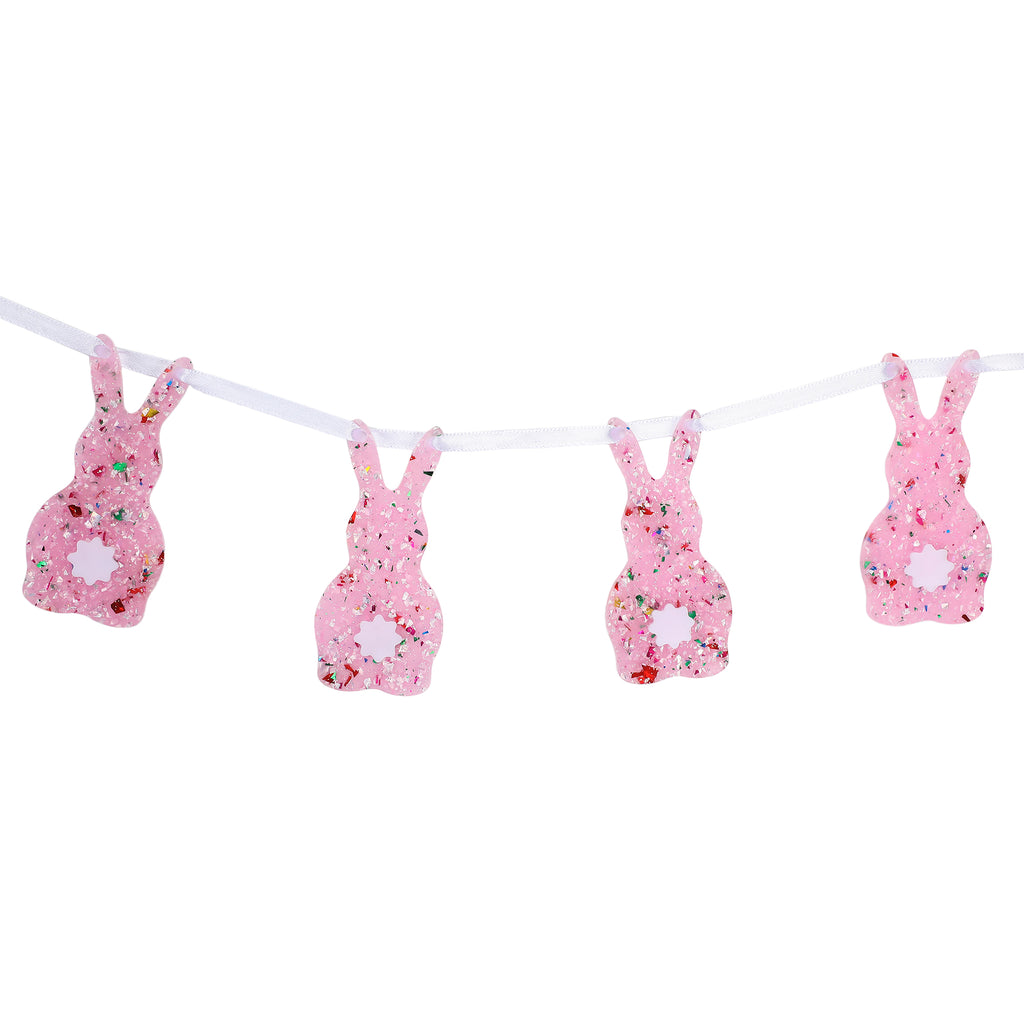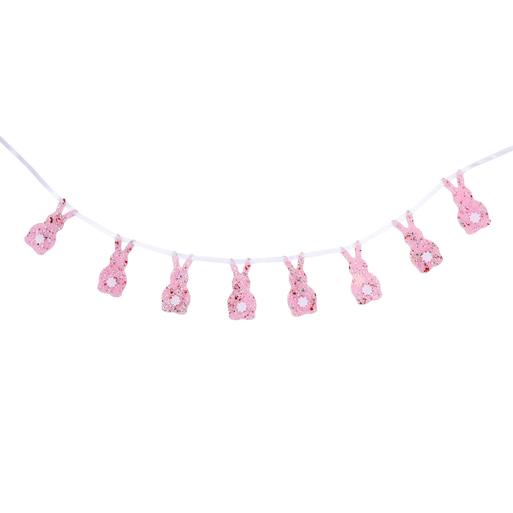 Add instant charm and sparkle to your spring décor with this bunny garland. Featuring eight adorable bunny silhouettes filled with shimmering multicolor confetti and glitter, each piece is strung along a soft pink ribbon for a sweet, festive finish.