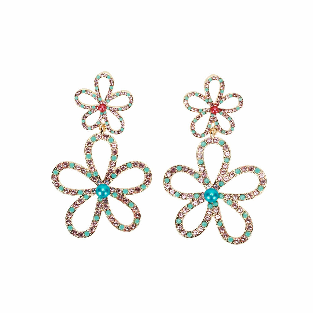 Turn every outfit into a celebration with these pastel-perfect statement earrings. Featuring layered flower silhouettes outlined in shiny gold tone metal, these drop earrings sparkle with multicolor stone details that catch the light from every angle. Playful yet polished, they’re the ultimate finishing touch for parties, brunch dates, birthdays, and all things spring. Lightweight and hypoallergenic for comfortable all-day wear, these floral earrings bring bold color, retro charm, and Packed Party-approved fun to your jewelry collection. Style tip: Pair with a gingham dress, colorful clutch, or anything that calls for a little extra sparkle.