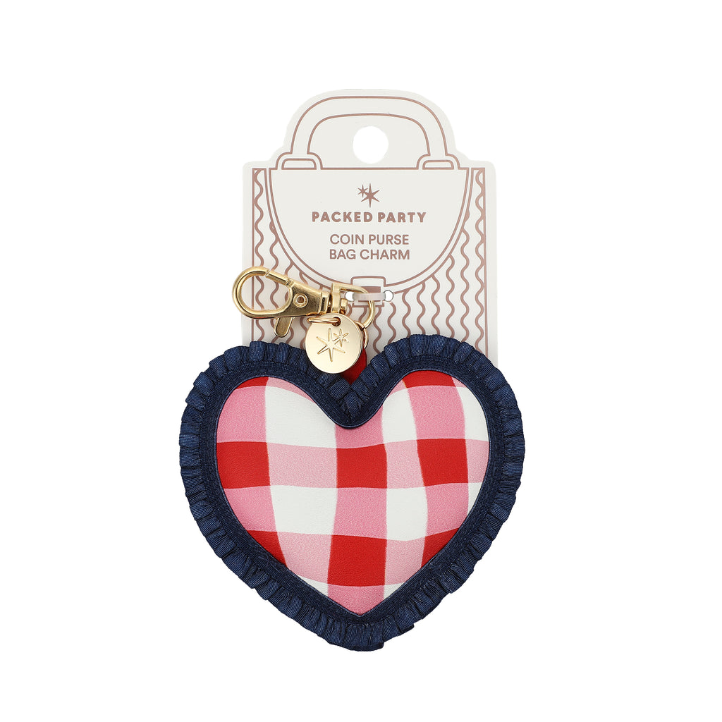 Add a little love (and a lot of charm) to your everyday carry. The Gingham Heart Bag Charm is the cutest finishing touch for totes, backpacks, keys, and more. Designed with a classic red-and-white gingham print, plush poly filling, and a flirty ruffled edge, this heart-shaped charm brings instant picnic-perfect vibes wherever it goes. Finished with shiny gold hardware and a signature Packed Party logo charm, it clips on easily and makes every bag feel a little more fun. Equal parts sweet, nostalgic, and statement-making - this is the accessory your bag’s been waiting for. Because every bag deserves a little sweetheart moment.