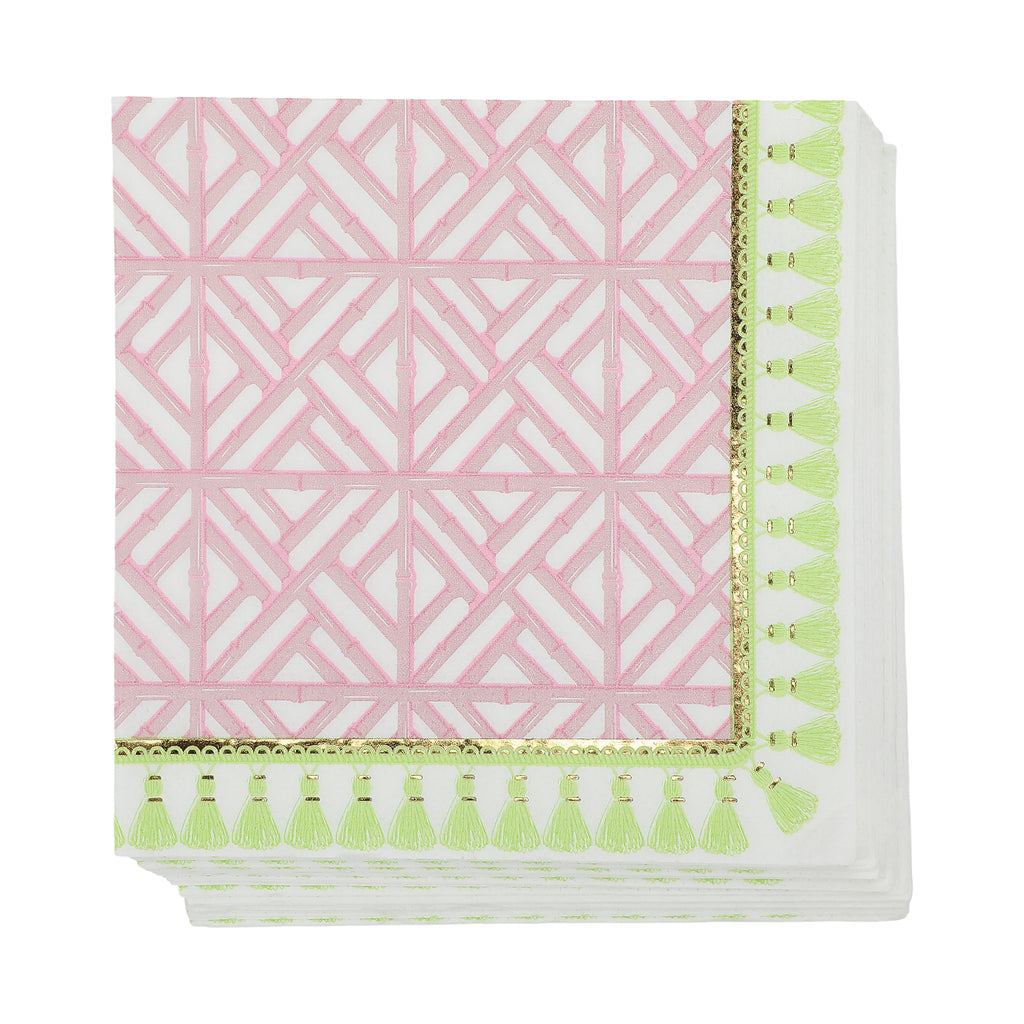 Dress up your drinks and desserts with the Cabana Club Cocktail Napkin Set. Featuring a graphic pink geometric lattice pattern and finished with playful tassel-inspired details, these cocktail napkins add an elevated yet fun touch to any gathering.