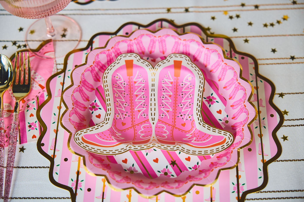 Dessert just got a whole lot more fun with the Packed Party Boot Scoot Blooms Cowboy Boot Dessert Plate Set! These plates are shaped like the cutest pink cowboy boots and topped with dazzling gold foil accents. Saddle up, serve it up, and let the dessert do the two-step! Size- 10"; pack of 10